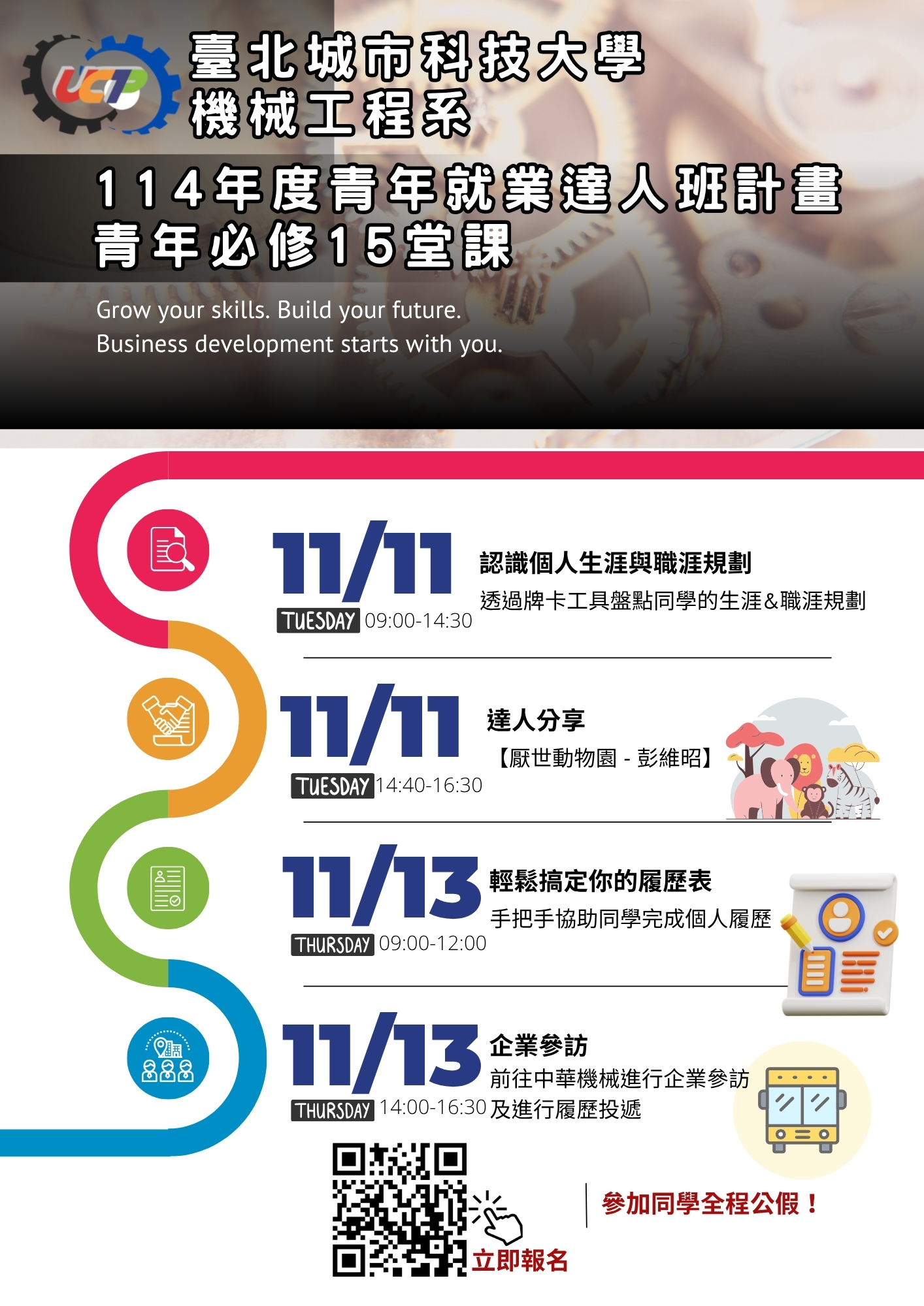 【實習就業】臺北城市科大機械系114年度青年就業達人班計畫--青年必修15堂課